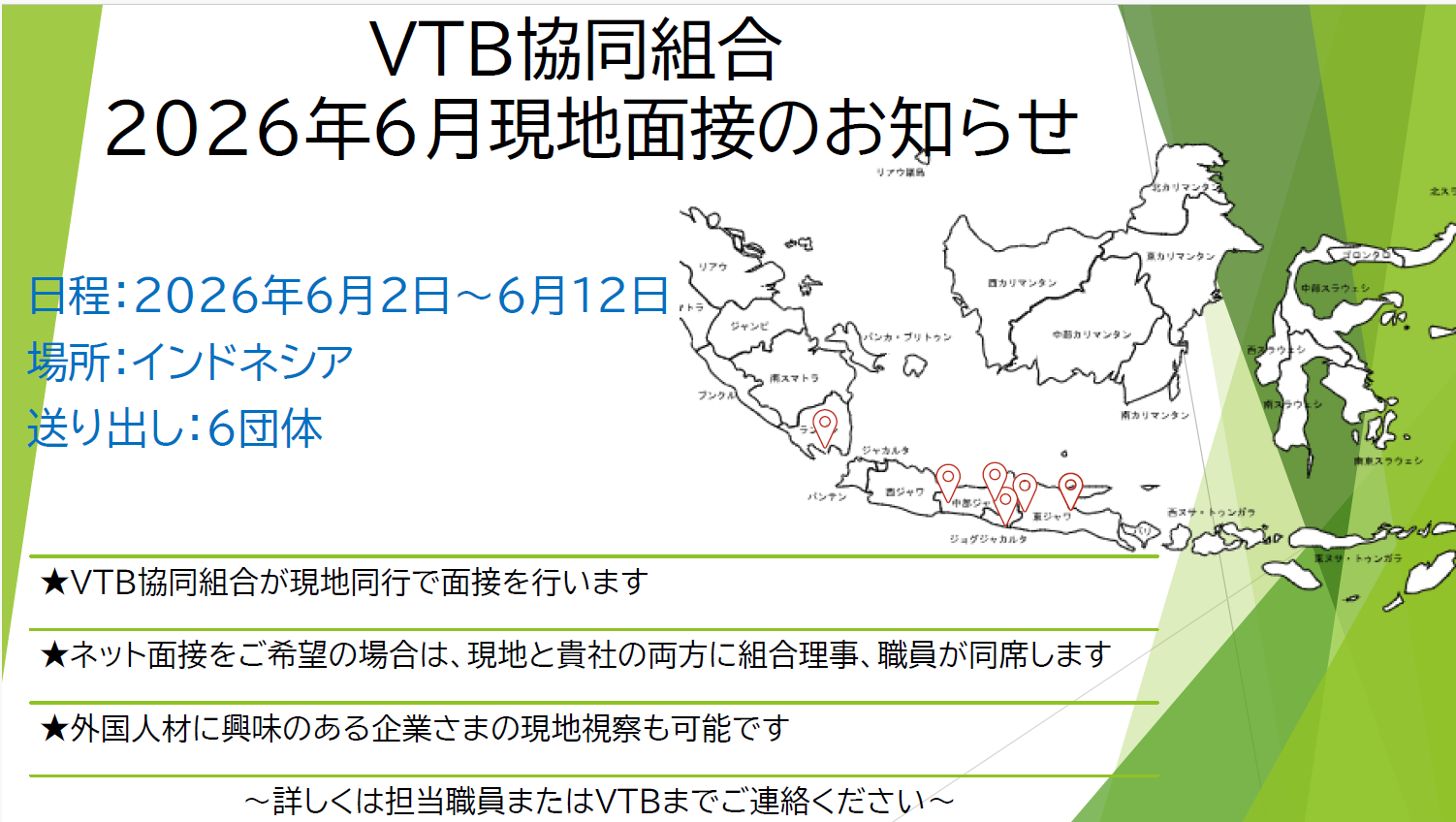 6月インドネシア面接につきまして 2026/04/28 6月上旬に、実習生面接でインドネシアへ訪問します。 インドネシア実習生の受け入れを検討されている企業様、またインドネシアへの訪問をご希望の 企業様がいらっしゃいましたら、お気軽に幣組合、または巡回担当者までお問合せください。